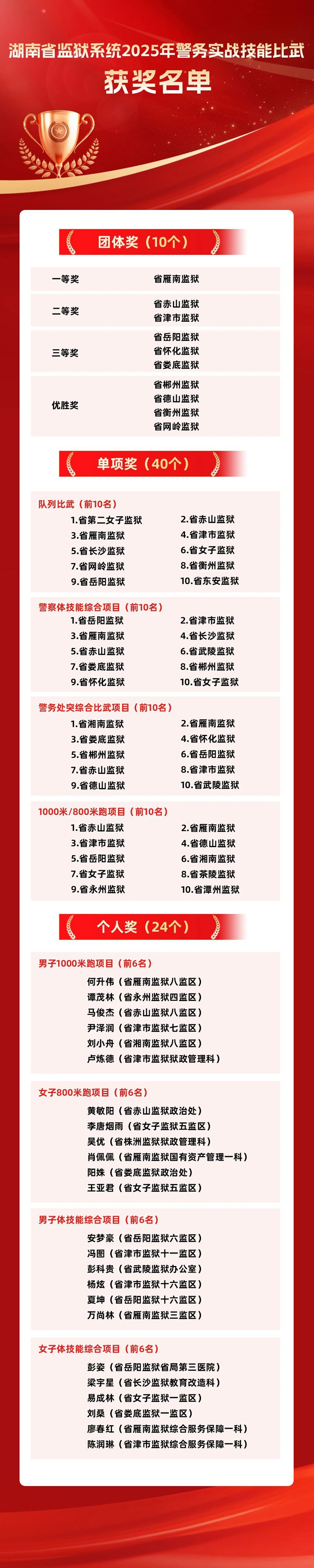 經過激烈比拼,最終雁南監獄榮獲團體一等獎,赤山、津市監獄獲團體二等獎,岳陽、懷化、婁底監獄獲團體三等獎。其他獎項也花落各家。