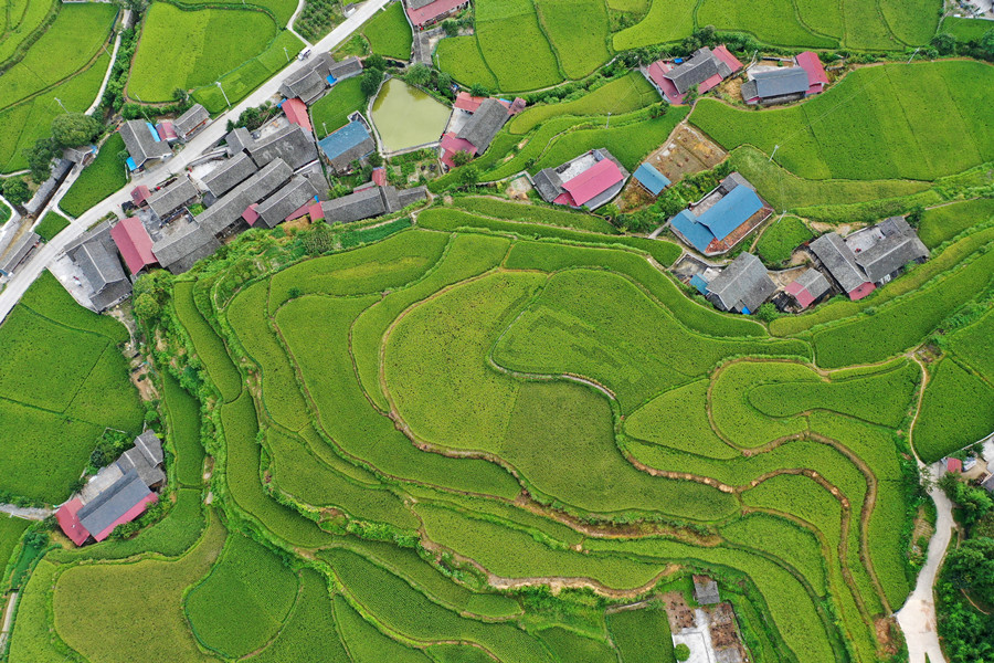 8月9日,三道坑鎮五郎溪村,初秋的梯田與村舍相互輝映,組成一幅美麗的鄉村畫卷。