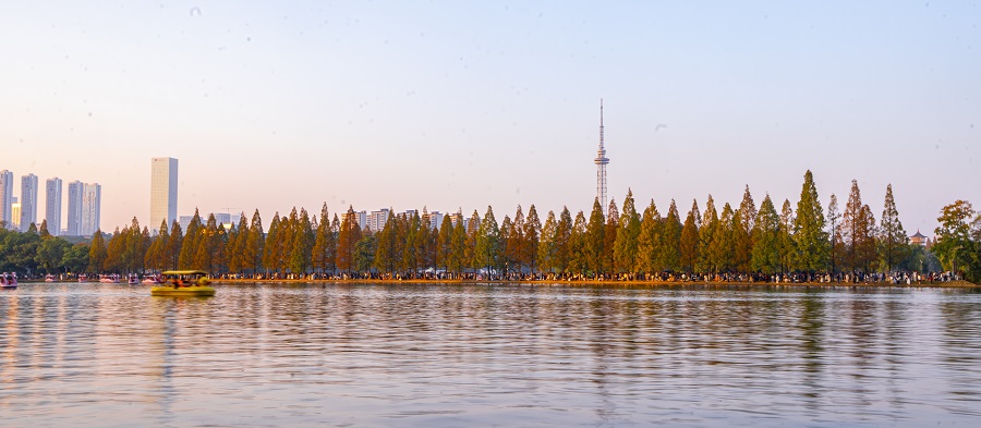 11月15日,湖南烈士公園年嘉湖畔,成排水杉由綠轉紅,倒映在湖面如油畫般絢麗,引得市民紛紛前來賞景拍照。湖南日報全媒體記者 童臻熙 攝