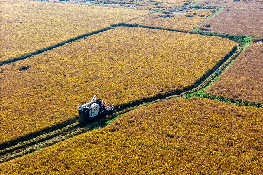 11月16日,雙峰縣梓門橋鎮合心村,農民駕駛著收割機收割晚稻。初冬時節,該縣晚稻進入收獲尾聲,收割機在金黃稻田中穿梭作業,確保秋糧顆粒歸倉。李建新 攝(湖南圖片庫)