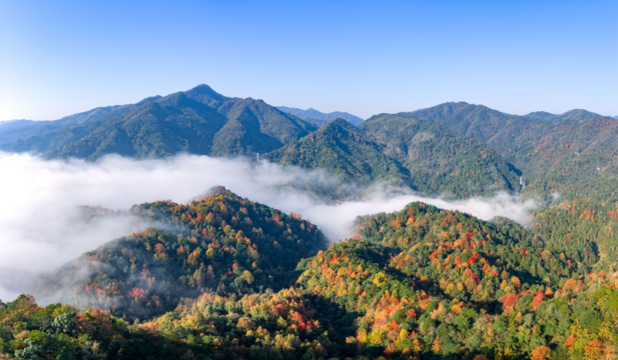 11月16日,會同縣鷹嘴界國家級自然保護區迎來一年中最絢爛的季節,層林盡染,景色如畫。張鐳 攝(湖南圖片庫)