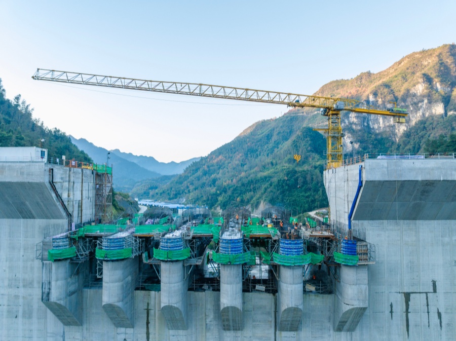 11月28日,吉首市矮寨鎮大興寨水庫工程建設現場,工人正在進行8#9#溢流壩段施工。初冬時節,工程建設單位科學調度施工力量,利用晴好天氣和枯水期窗口,確保該重點水利工程按計劃高效推進。彭璟 攝(湖南圖片庫)