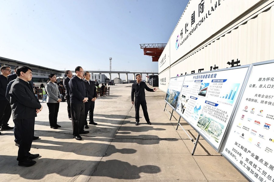 隨后,毛偉明一行來到懷化國際陸港公司,了解企業最新發展情況,并與大家座談。他說,自2021年9月啟動建設以來,懷化國際陸港步入發展快車道,預計今年提前一年完成班列開行達1000列以上、貨物吞吐量達1000萬噸以上、總產值達1000億元以上的“三個一千”目標。“十五五”期間,懷化市和有關部門要按照“量質并舉、以質取勝,提升功能、提高效能,做高平臺、做強產業,政府引導、市場主導”的要求,用好用足政策優勢、區位優勢、開放優勢,持續在加強貨物集結、優化貨運結構、降低物流成本上下功夫,著力打造一批特色鮮明的支柱企業、主導產業,加快以港興產、以產促港、港產城一體化融合發展,奮力建設一流國際陸港。