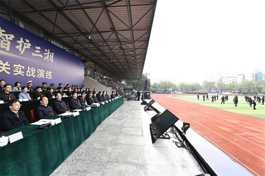 演練場(chǎng)上,一大批高精尖的警用武器裝備悉數(shù)亮相,千余名能戰(zhàn)善戰(zhàn)的公安精銳反應(yīng)迅速、配合默契,全面展現(xiàn)了湖南公安“智慧科技+實(shí)戰(zhàn)能力”的硬核實(shí)力。毛偉明認(rèn)真觀看實(shí)戰(zhàn)演練,為大家的昂揚(yáng)斗志、過硬本領(lǐng)“點(diǎn)贊”。他指出,舉行實(shí)戰(zhàn)演練,是對(duì)我省公安實(shí)戰(zhàn)能力的全面檢驗(yàn),是推進(jìn)公安鐵軍建設(shè)的重要抓手。大家要以此為新起點(diǎn),不斷錘煉實(shí)戰(zhàn)本領(lǐng),始終堅(jiān)持底線思維、極限思維,聚焦各類實(shí)戰(zhàn)場(chǎng)景錘煉過硬本領(lǐng),確保一旦發(fā)生重大突發(fā)事件,能夠快速反應(yīng)、高效聯(lián)動(dòng)、妥善處置。持續(xù)提升新質(zhì)戰(zhàn)斗力,充分發(fā)揮“專業(yè)+機(jī)制+大數(shù)據(jù)”新型警務(wù)運(yùn)行模式的實(shí)戰(zhàn)效能,提升精確預(yù)警、精細(xì)管控、精準(zhǔn)打防能力。強(qiáng)化作風(fēng)能力建設(shè),嚴(yán)明警紀(jì)、純潔隊(duì)伍,著力鍛造一支忠誠(chéng)干凈擔(dān)當(dāng)?shù)男聲r(shí)代公安鐵軍。