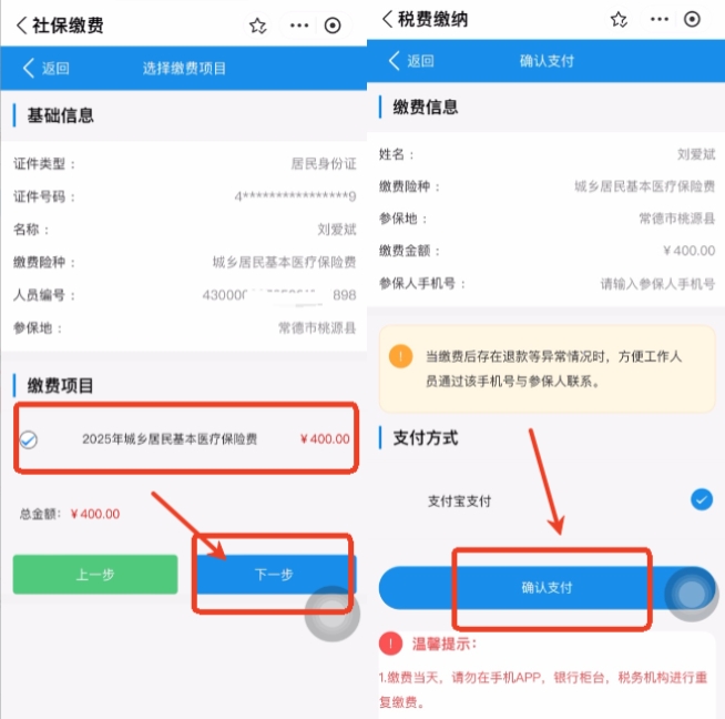 在“湘易辦”APP或“湘易辦”支付寶、微信小程序的“社保繳費(fèi)”專區(qū)選擇對應(yīng)繳費(fèi)類型,填寫參保人員信息,選擇醫(yī)療保險(xiǎn)繳費(fèi)險(xiǎn)種,并選擇2026年繳費(fèi)年度,即可點(diǎn)擊“下一步”完成在線支付流程。
