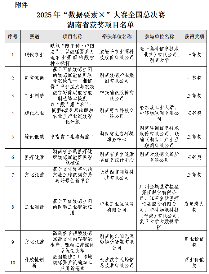 10月29日,國(guó)家數(shù)據(jù)局公布了2025年“數(shù)據(jù)要素×”大賽全國(guó)總決賽獲獎(jiǎng)項(xiàng)目名單,湖南共有10個(gè)項(xiàng)目獲獎(jiǎng),其中2個(gè)項(xiàng)目獲一等獎(jiǎng)、5個(gè)項(xiàng)目獲三等獎(jiǎng)、1個(gè)項(xiàng)目獲發(fā)展?jié)摿Κ?jiǎng)、2個(gè)項(xiàng)目獲商業(yè)價(jià)值獎(jiǎng),獲一等獎(jiǎng)項(xiàng)目數(shù)居全國(guó)第二、中部省份第一。