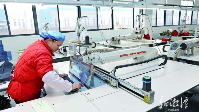 永霏集團自動裁縫生產線上,工作人員置入設計模塊。(李新輝 攝)